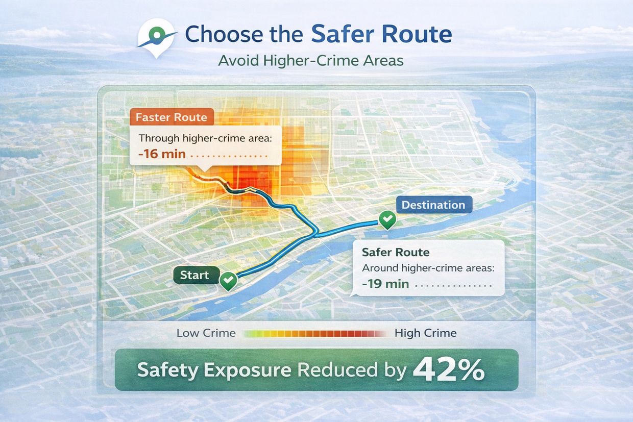SaferTravels helps travelers navigate unfamiliar cities with confidence and peace of mind. Visualize crime density and choose routes that may reduce exposure to higher-risk areas.